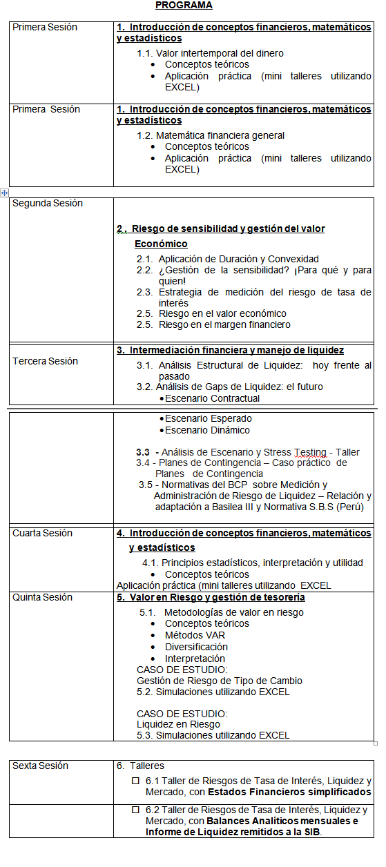 Información sobre CURSO TALLER INTENSIVO DE RIESGOS DE LIQUIDEZ Y MERCADO - disponible in company se podria tomar el curso de manera online desde Bolivia y sobre Aplicación práctica de la Autoevaluación de Riesgos para identificación y medición del riesgo operacional si se podria tambien pasar material por favor el segundo tema me interesa mucho estaré atenta a la respuesta por favor. y el precio para ambos